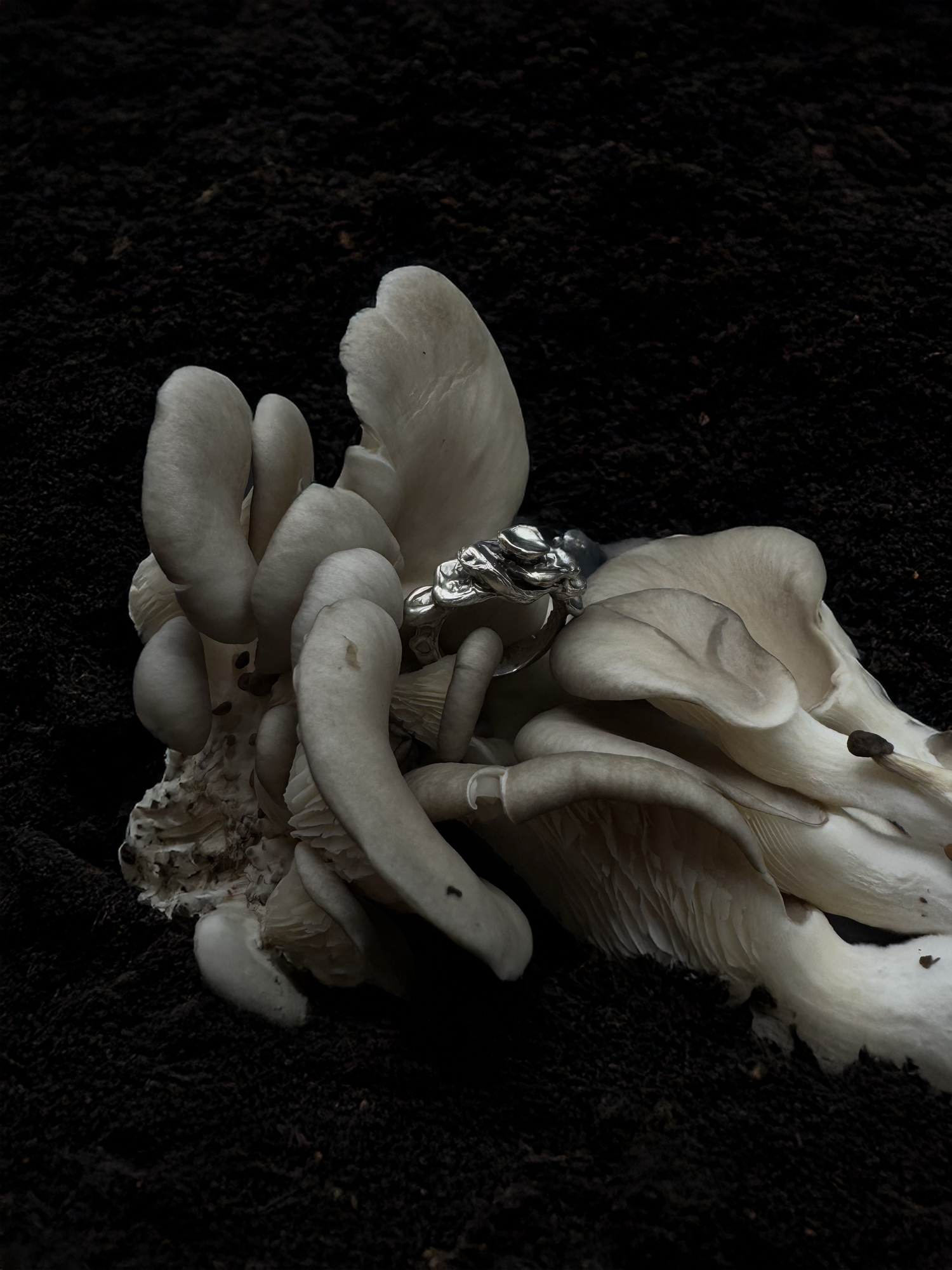 Inspired by the ethereal beauty of the oyster mushroom, known in Thai as เห็ดนางฟ้า or 'Angel Mushroom,' this custom-made ring is as celestial as its namesake. Crafted for a client who embodies the grace and purity of an angel, the design intricately captures the delicate essence of both the mushroom and its muse.
